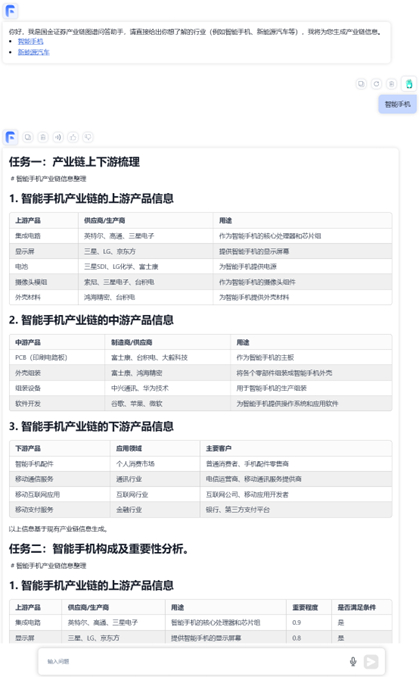 大模型产业链挖掘是国金证券首先在业内提出的大模型特色应用场景。国金证券研究所和科技团队充分合作,进行了大模型自动生成产业链图谱的初步尝试,可以根据最新舆情挖掘投资标的、产业链上下游、关联度等信息,从而快速认知市场。