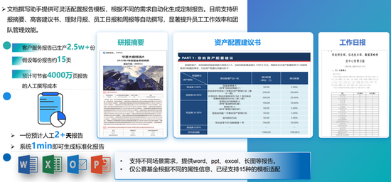 系统根据定制化模板自动生成标准报告,比如研报摘要、高客建议书、理财月报、员工日报、周报等,目前文档撰写助手已生成2.5万+份客户服务报告,预计节省4000万页报告的人工撰写成本。而且系统1分钟内就可生成人工需要2天的报告,显著提升员工办公效率。