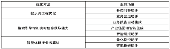 上述三种优化方法不是互斥的,可以联合使用,多次迭代直至最优。表1总结了大模型优化方法及其适用证券业务场景。