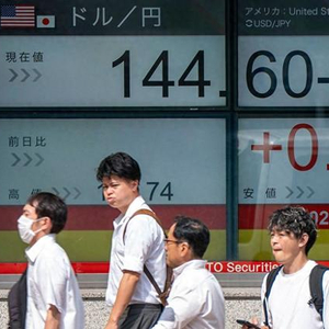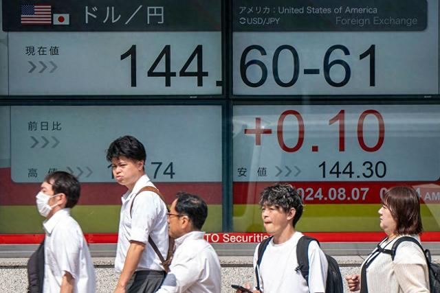 8月7日,民众走过位于日本东京的显示美元兑日元汇率的电子报价板。(视觉中国)