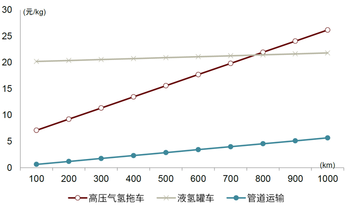 我们认为,气氢拖车成本对运输距离较为敏感,不适合远距离的绿氢消纳。根据《氢能储运关键技术研究进展及发展趋势探讨》(李敬法等,2023),现有技术条件下气氢拖车、液氢槽车和氢气管道的运输可变成本分别为0.0212元/kg·km和0.0018元/kg·km和0.0056元/kg,气氢拖车的运输成本对距离较为敏感,在距离超过800km后运输成本将超过液氢槽车,同时气氢拖车的体积能量密度仅有液氢槽车的1/15,因此不适合远距离大规模运输。