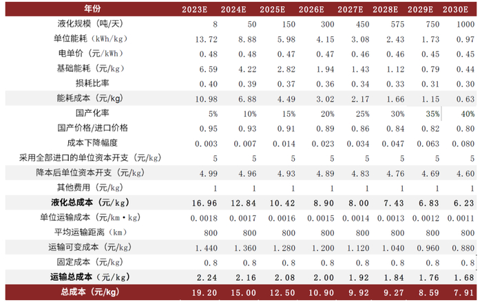 图表:液氢储运成本测算(2023E-2030E)