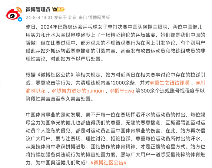 8月4日,微博管理员根据《微博社区公约》等相关规定,对此前在相关赛事讨论中存在的拉踩引战、恶意攻击等行为,共清理违规内容12000余条,并对300余个违规账号视程度予以阶段性禁言直至永久禁言处置。