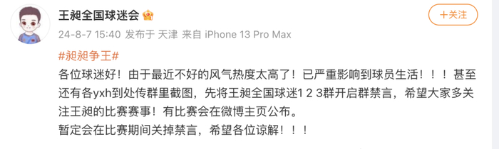 昨天下午三点,账号王昶全国球迷会发文,几个球迷群开启禁言。“由于最近不好的风气热度太高了,已严重影响到球员生活。”