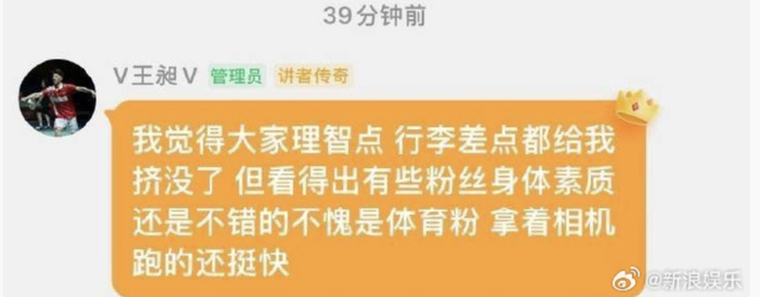 对此,王昶在粉丝群回应:“我觉得大家理智点,行李差点都给我挤没了。但看得出有些粉丝身体素质还是不错的,不愧是体育粉,拿着相机跑得还挺快。”