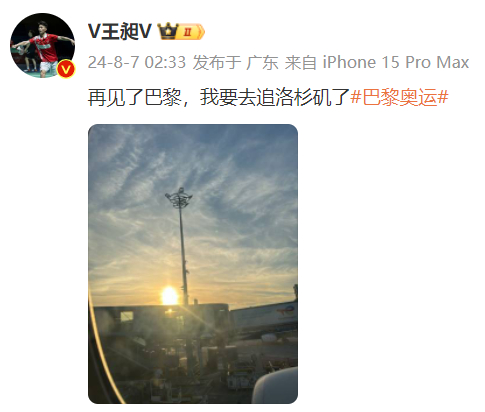 8月7日凌晨,王昶社媒晒出一张在机场的照片,他同时配文:“再见了巴黎,我要去追洛杉矶了”,告别了这次的巴黎之行。