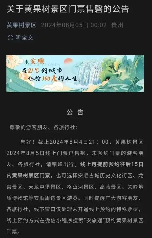 公告内容显示,截至2024年8月4日21:00,黄果树景区2024年8月5日线上门票已售罄,未预约门票的游客朋友、各旅行社,请错峰出行。