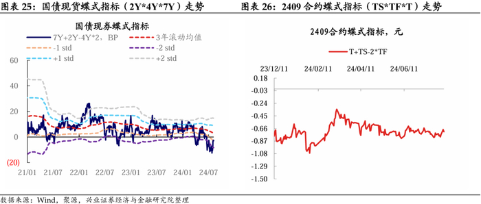 7月1日-8月6日期间,国债现券7Y-2Y、4Y-2Y利差均是先走阔后收窄,整体收窄,国债30Y-7Y利差继续走阔,7Y-4Y利差则变化不大。截至8月6日,现券4Y-2Y利差约为23BP,略低于3年滚动均值+1倍标准差的位置;现券7Y-4Y利差约为20BP,略高于3年滚动均值-1倍标准差的位置;现券7Y-2Y利差约为44BP,略高于3年滚动均值水平;现券30Y-7Y利差约为39BP,略低于3年滚动均值。期债指标中4*TS-T指标走势与对应的现券指标存在差异,主要是相较于6月底的水平,T2409基差小幅上升,而TS2409基差则略有下降。