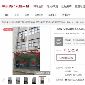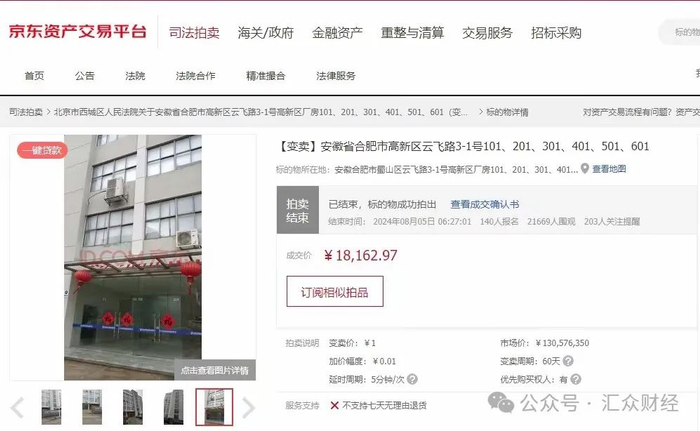7月7日起,北京市西城区人民法院在京东资产交易平台发布公告,将于2024年8月2日10时起,在北京市西城区人民法院京东网司法拍卖网络平台上进行公开变卖活动。此次变卖的厂房位于安徽省合肥市高新区云飞路,总层数为6层,总建筑面积为9550.64平方米,房屋结构为钢筋混凝土,规划用途为工业。