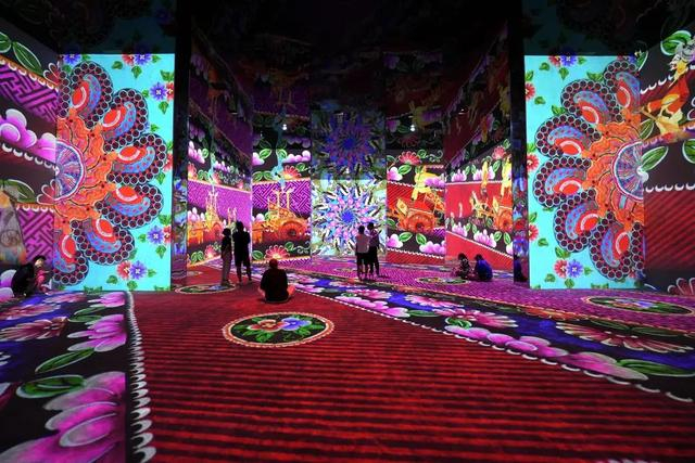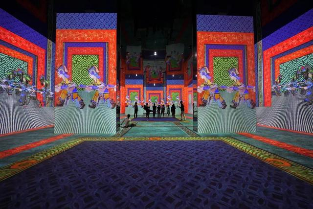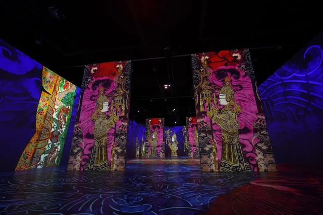 此次展览邀请了中、法、意三方设计师,共百人团队,耗时五万个小时,通过蓝屏技术捕捉马氏皮影第六代传人的真实表演,并结合当代审美需求,提取了众多习以为常或不足为奇的纹样元素,放大成为空间重要的装饰元素,给观众带来更具视觉冲击力的沉浸式体验设计。人物、建筑、花草树木等元素,巧妙地布置在一个立体的三维环境中,叠加光影运用和空间布局,皮影艺术从平面走向立体,从二维走向三维,为观众营造出了一种强烈的深度感,是一种全新的沉浸式体验。