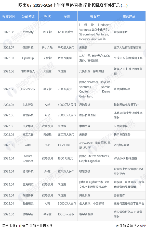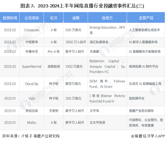 2023年-2024上半年网络直播行业的主要投融资事件如下所示: