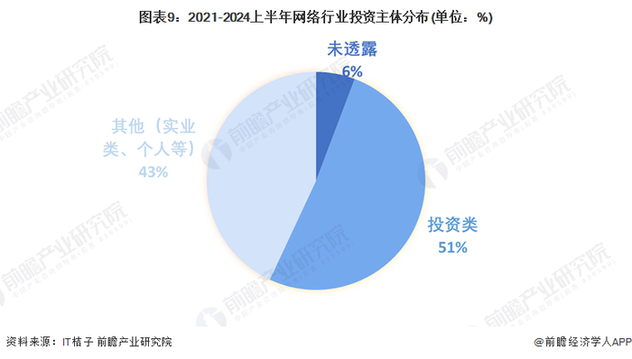 网络直播作为新兴行业,近十年才开始起步发展,但成长迅速,行业头部企业也出现多轮更替,投融资规模起伏也较大。根据IT桔子数据库,2016年是网络直播元年,彼时行业投资火爆,但随后投资数量不断下滑,从2016年的215起降至2019年的27起,但投资金额依旧不减,2018年突破200亿大关。随后2019-2021年我国网络行业融资事件再次上涨,但2020年投资金额已呈现断崖式下跌,2021年后我国网络直播行业融资事件、融资金额双双下滑。2024年上半年我国网络直播行业融资规模仍持续减小,融资事件共12起,同比下降14.29%,融资金额共2.84亿元,同比下降49.38%。