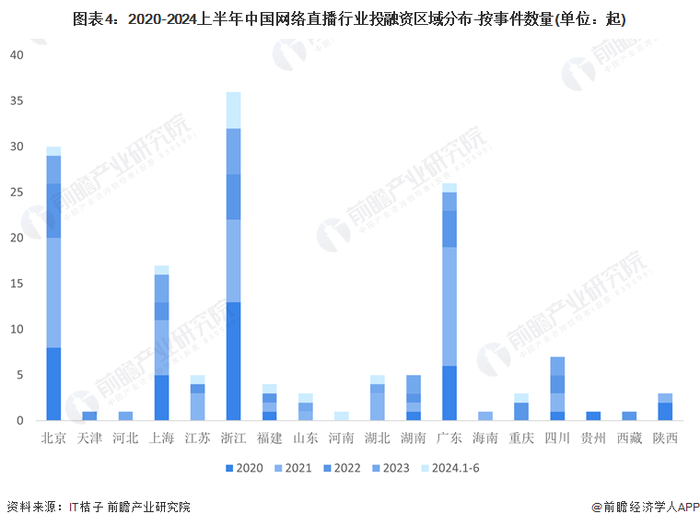从网络直播行业的企业融资区域来看,网络直播行业发展具有显著的地区特征,不同地区发展水平差异很大。新冠疫情期间以来,浙江省融资企业最多,2020-2024上半年累计达到36起,其中2024年上半年已累计4起,而2024年上半年网络直播行业国内融资事件仅有12起,由此浙江区域的网络直播投融资活跃度可见一斑。