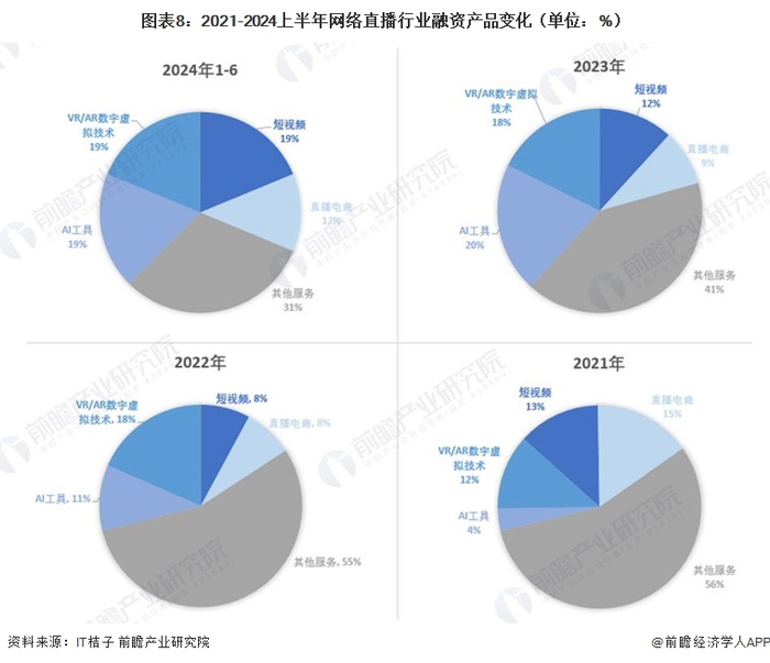 从2021-2024上半年融资企业的主营产品分析得知,主营产品类型主要包括短视频、直播电商、AI工具、VR及数字虚拟技术应用、其他服务,投资热点从2021年的MCN机构等运营服务商,到2023-2024上半年短视频、AI工具和VR及数字虚拟技术应用。