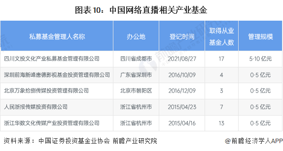 网络直播作为一种技术应用和平台,与其他各行各业联系较为紧密,当前网络直播行业自身的产业投资基金很少,无法在中国证券投资基金业协会中查询到相关产业,但相关文娱、影视、传媒类投资基金较多,以下是相关代表性投资管理有限公司。