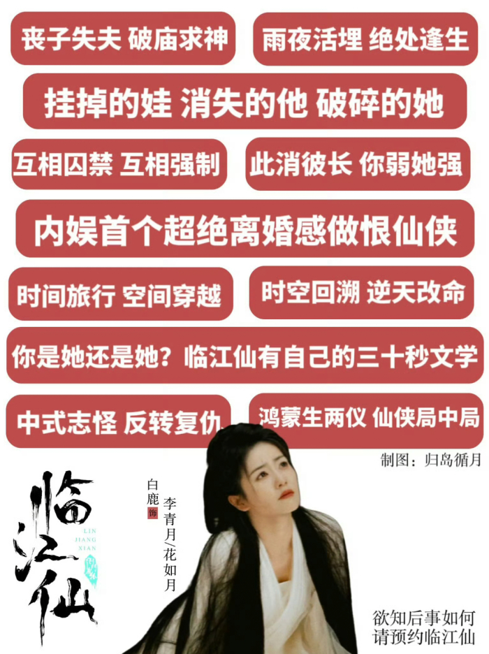 此外还有原创剧本的于正剧《临江仙》,剧情被于正描述得云山雾罩。但白鹿抱孩子的路透画面、海报中男女主浓浓的“做恨”氛围是很明确的,粉丝秒提取重点。
