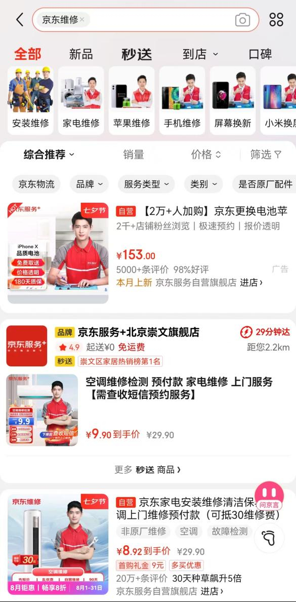 京东自营家电维修服务范围覆盖空调、电视、冰箱、洗衣机、热水器等常用家电品类,可有效满足居民日常家电维修需求。时效方面,在社区4公里范围内布局直营站点,通过智能派工、直派到人的模式,全面提升派单、预约、上门服务等各环节的效率;收费方面,价格透明、用户满意再付款,不仅杜绝了乱收费行为,还承诺“若乱收费双倍赔付”;售后方面,同部位、同性质故障享有长达90天的质保期,并为维修售后问题上了工单险“托底”,让消费者吃下“定心丸”。有维修需求的居民只需打开京东APP,搜索“京东维修”,即可进入京东服务自营旗舰店,根据自身需求选择相应的家电维修服务,按照页面提示下单后即可坐等师傅预约上门。