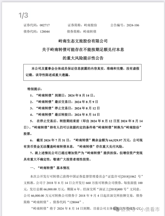 近日,岭南股份(002717.SZ)公告称,“岭南转债”到期日为2024年8月14日 ,截至2024年7月31日,“岭南转债”剩余金额为6.45亿元,公司现有货币资金无法覆盖岭南转债本息,“岭南转债”存在重大兑付风险。