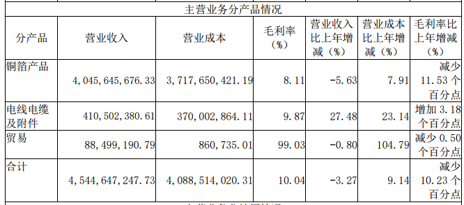 诺德股份2023年主营业务分产品情况来看:公司主营为铜箔产品、电线电缆及附件、贸易、其他业务,占比为69.02%、8.52%、18.44%、4.02%,分别实现营收40.46亿元、4.11亿元、8849.92万元、2695.12万元,毛利率分别为8.11%、9.87%、99.03%、70.93%。