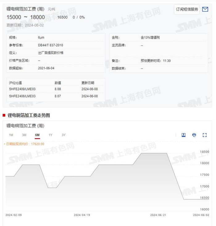 据SMM报价显示:SMM锂电铜箔加工费6μm(周)8月2日当周的报价为15000-18000元/吨,均价为16500元/吨。