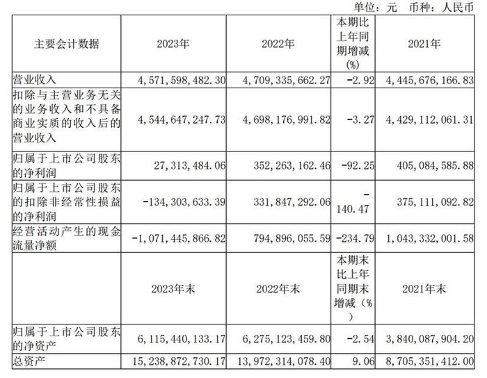此外,回顾诺德股份此前发布2023年年报可以看出:2023年,公司实现营业收入45.72亿元,同比下降2.92%,实现归母净利润2731万元,同比下降92.25%,实现经营活动产生的现金流量净额-10.71亿元,同比转负,资产负债率为49.86%,同比上升5.31个百分点。对于营业收入变动的原因,诺德股份表示:主要系公司本期产品销售价格降低等所致。