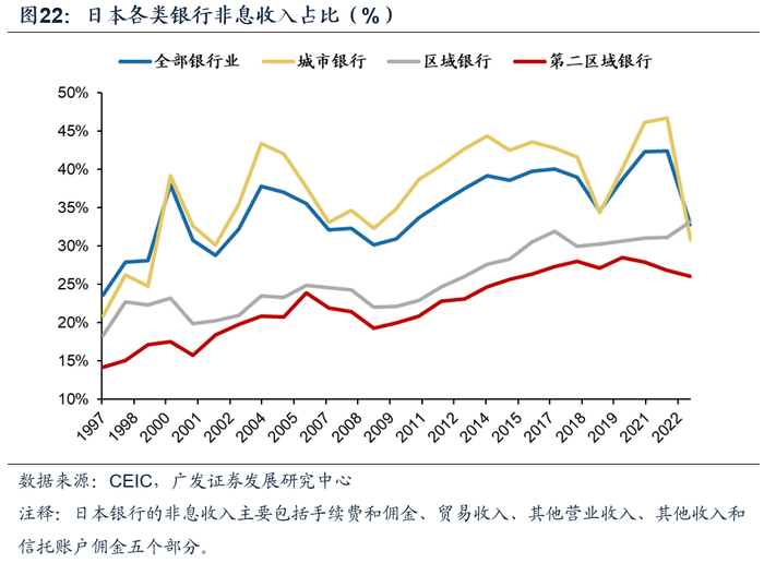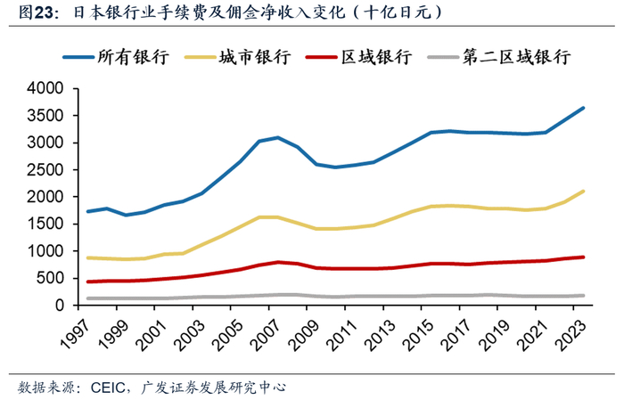 在非息收入中,以最为典型的手续费与佣金为例,日本银行在此类业务上的收入规模显著增加。1998年1月日本的禁令解除之后,银行既可以拥有证券和信托银行子公司,也可以收购证券公司或信托公司等形成金融控股公司,促使其可以提供更多元化的金融服务,从而增加手续费和佣金收入。其次,日本取消了对各类金融子公司业务范围的限制及普通银行长短期业务领域方面的限制。CEIC披露数据显示,日本银行“手续费及佣金收入”在非息收入中的占比从1997年初的17%提升至2023年初的50%。从银行类型来看,城市银行手续费及佣金收入规模上行更快,1997-2023年其规模从0.87万亿日元上升至2.1万亿日元。