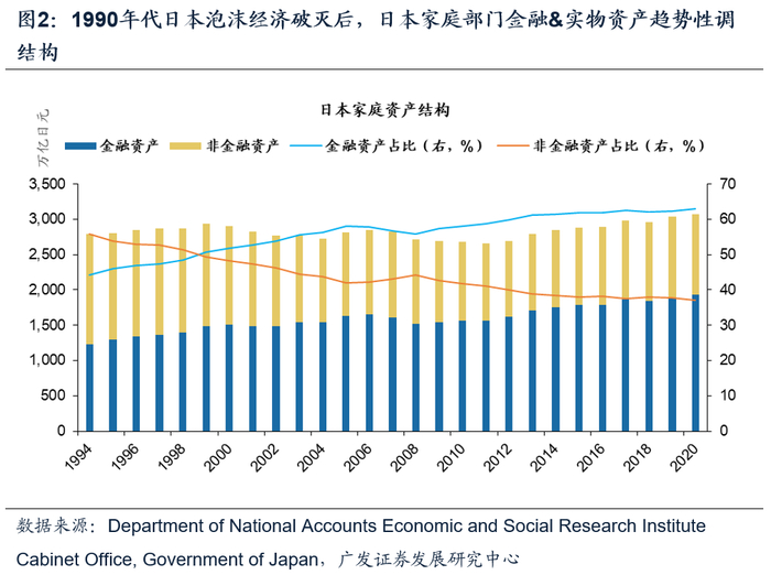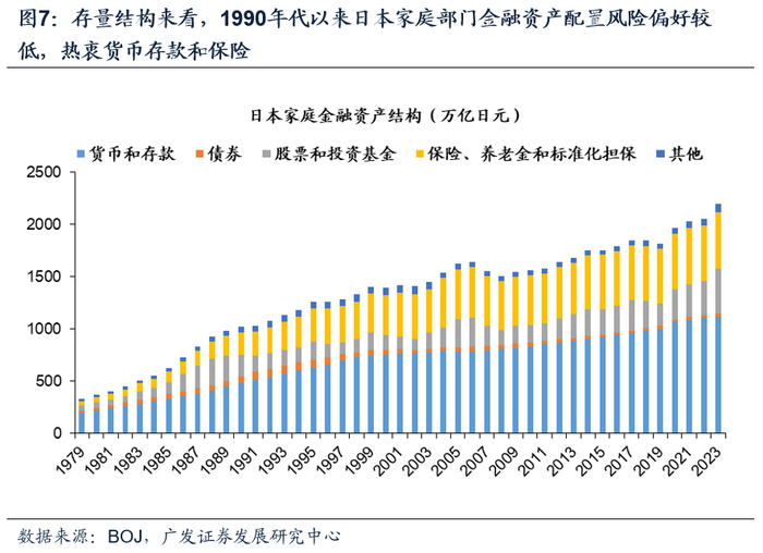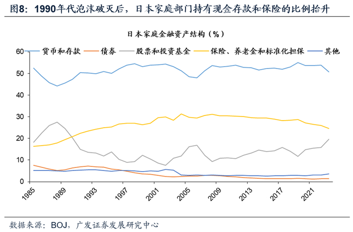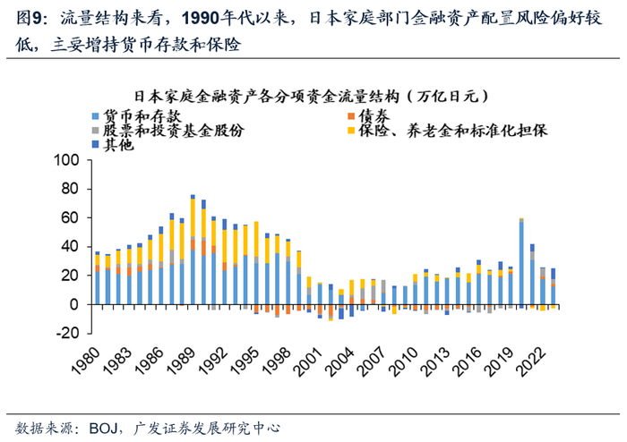 1990年代泡沫破灭后,日本步入债务收缩期,家庭部门金融资产配置风险偏好降低,热衷货币存款、保险等安全资产。