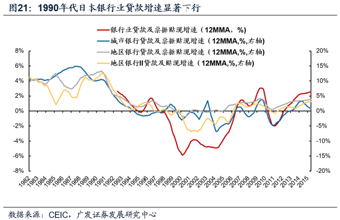 在债务收缩阶段,银行业也开始控制放贷规模以应对不良贷款问题。从1990年代日本银行业资产端结构的变迁来看,日本银行业开始增加“现金、同业拆借和证券等”稳健资产的配置比例,并有意控制贷款类等风险资产的比重。根据BOJ及CEIC所披露的数据,在1982年到1990年期间,城市银行、第一类地区银行和第二类地区银行的贷款年复增速分别为11.5%、10.1%和8.0%,而在进入债务收缩期后的1990年至2005年期间,城市银行、第一类地区银行、第二类地区银行的贷款年复合增速下滑至为-0.7%、1.3%和-0.9%,银行业贷款年复合增速在1992年至2005年期间为-2.1%。同时银行业中的“贷款和票据贴现”资产占比从1993年的65.0%下降至2005年54.0%,而同期现金资产、同业拆借以及证券投资等资产占比从24.9%上升至34.4%。