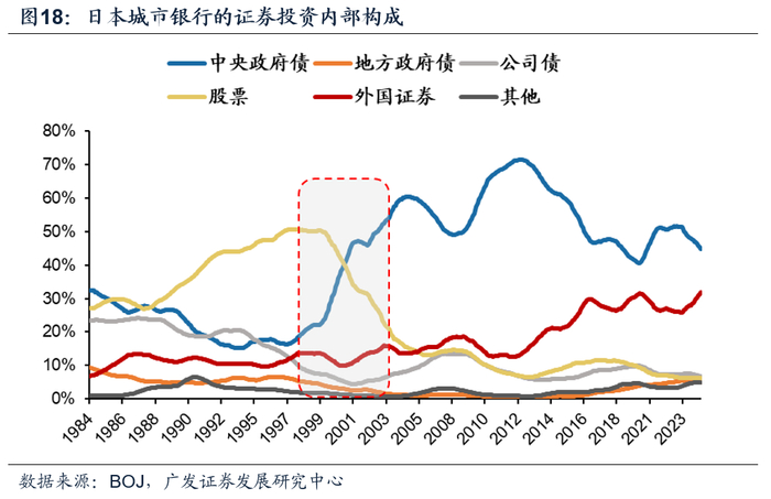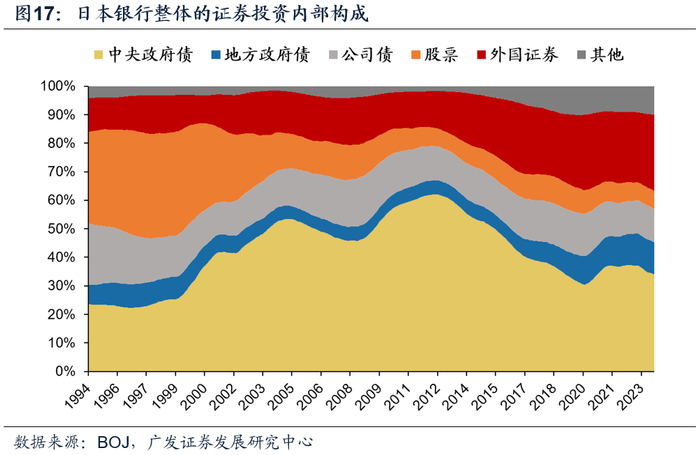 日本银行理财对于国内资产的配置主要是增配中央政府债。整个1990年代日本尚处于债务收缩阶段,资产泡沫破灭,利率大幅下滑,日本股价和房价均陷入自我强化式下跌。在此背景下,日本银行理财开始大量增持国债,其中以中央政府债为主,根据BOJ数据,其占证券投资比例从1998年初的23.3%上升至2012年初的61.2%。1998年亚洲金融危机后,银行理财开始降低国内股票在资产端中的占比,日本城市银行资产端也呈现出类似的变化趋势。