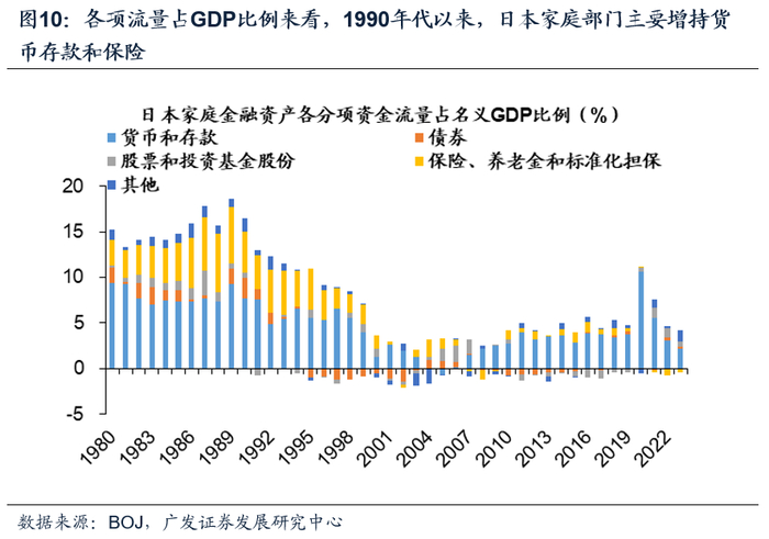 (1)资产存量结构来看,诸如货币存款、保险等安全金融资产自1990年保持扩张趋势,整体占比持续抬升。(2)资产流量结构来看,流量结构能够剔除资产价格波动的影响,更直观的反应家庭部门的增持意愿。1990年以来,日本家庭部门对于货币存款、保险等稳健金融资产的增持较为突出。