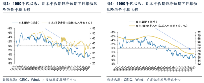 策略二:热衷货币和存款。1990年代日本泡沫经济破灭后,步入债务收缩期,日本家庭部门金融资产配置风险偏好降低,热衷货币存款、保险等安全资产。风险资产回报率恶化叠加市场风险偏好低位运行(债务问题叠加人口问题导致日本中长期收入&经济增长预期的恶化—>趋势性压低市场风险偏好),使得日本家庭 “分流到货币存款、保险等安全资产”。
