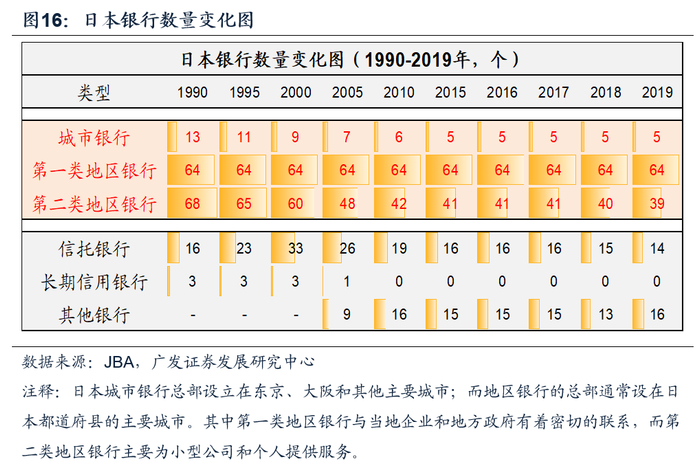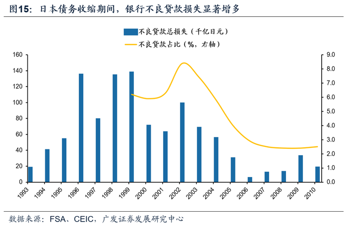 资产价格的下跌使得银行不良贷款损失显著上升,各类型的银行数量亦有不同程度的收缩。日本1990年代债务周期的泡沫破裂后,资产价格大幅下跌引发自我强化式的经济萧条。根据FSA及CEIC所披露数据,日本银行不良贷款损失从1993年1.64万亿日元上升到1996年13.4万亿日元,并在整个1990年代趋势上行,不良贷款率在此期间处于高位,1999年到2005年期间,平均不良贷款率达6.29%。