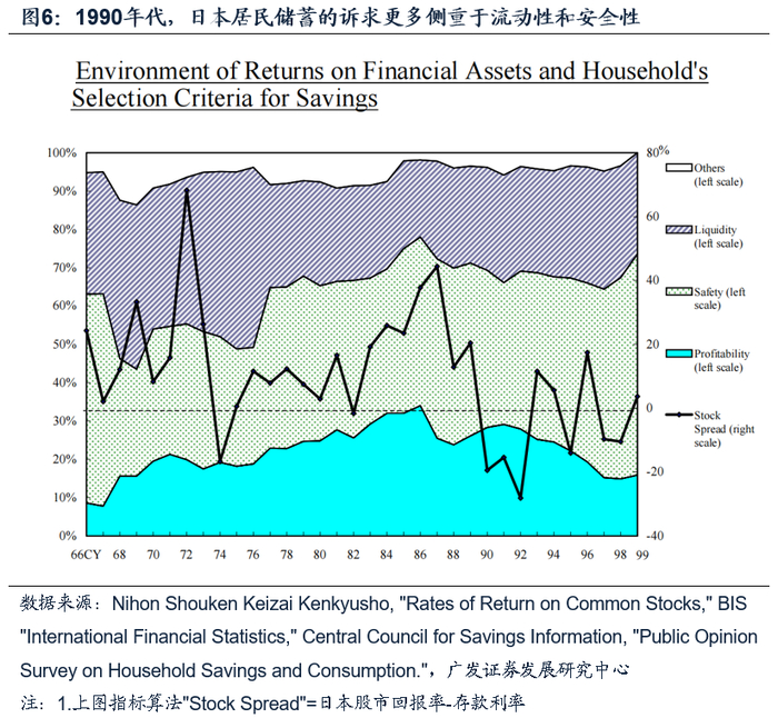 债务收缩期,风险资产回报率恶化叠加市场风险偏好低位运行(债务问题叠加人口问题导致日本中长期收入&经济增长预期的恶化—>趋势性压低市场风险偏好),使得日本家庭调整结构,“分流到安全资产”。根据《Portfolio Selection of Financial Assets by Japan’s Households》中的数据,1990年代以来,日本居民对于储蓄的诉求更多侧重安全性和流动性而非盈利性。