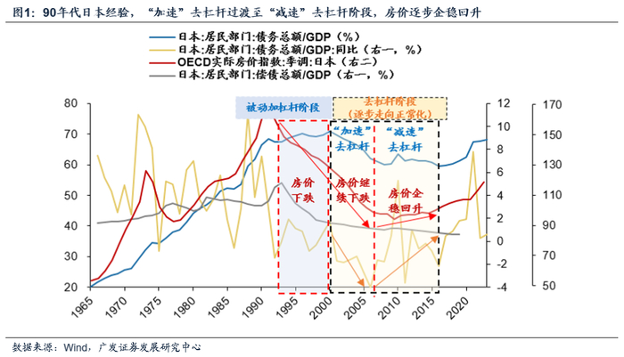 1990年代日本泡沫经济破灭后,步入债务收缩期,伴随房价持续下跌,日本家庭部门在土地和住宅等非金融资产中的配置比例持续下降,而对金融资产的配置比例持续上升。我们在24.7《债务周期看地产,大拐点来了吗?》提示,债务周期框架很好地推演了90年代后日本房价演绎:当“加速”去杠杆—>“减速”去杠杆,日本房价在2010年前后逐步企稳回升,日本家庭部门在土地和住宅等非金融资产中的配置比例也随之企稳(日本家庭部门在土地和住宅等非金融资产中的配置比例由1990年代初的近60%下降至2010年代的近40%)。