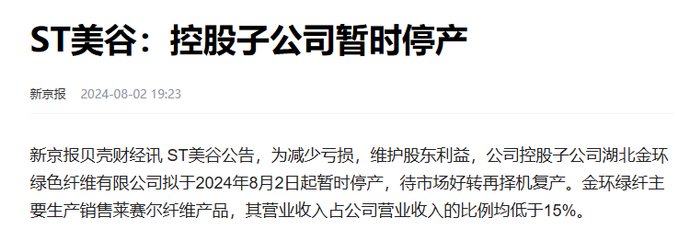 8月2日,ST美谷公告,为减少亏损,维护股东利益,公司控股子公司湖北金环绿色纤维有限公司拟于2024年8月2日起暂时停产,待市场好转再择机复产。金环绿纤主要生产销售莱赛尔纤维产品,其营业收入占公司营业收入的比例均低于15%。