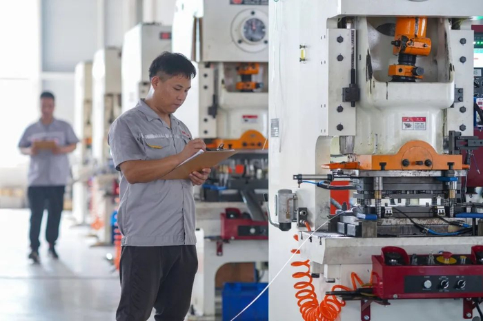 下左:8月6日,亚星不锈钢制品有限公司员工使用具有高效能冲床设备, 快速精准开展冲压作业。(霍红军摄)
