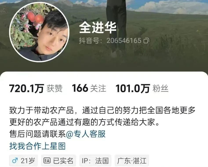 显然,他并不是躺在全红婵的功劳簿上吃红利的败家子,正如他在抖音账号的个人介绍里写道:“致力于带动农产品,通过自己的努力把全国各地更多更好的农产品通过有趣的方式传递给大家。”