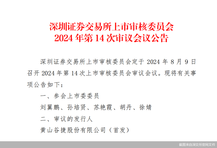 深交所官网披露文件显示,定于8月9日召开2024年第14次上市审核委员会审议会议,审核黄山谷捷首发事项。