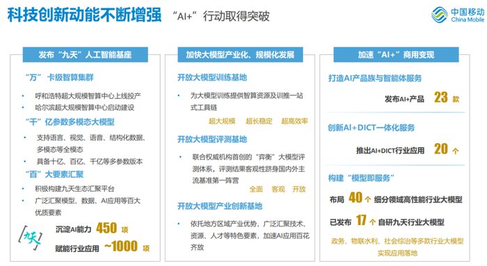 “AI+”行动方面,发布由万卡级智算集群、千亿多模态大模型、百大要素生态平台构成的“九天”人工智能基座。共沉淀450项AI能力、赋能近1000项行业应用。加快大模型产业化、规模化发展,开放大模型训练基地、评测基地、产业创新基地,向全社会提供模型训推、AI+原生应用孵化等一站式产业融通服务。目前,已推出23款AI+产品及20个AI+DICT行业应用,布局40个细分领域的高性能行业大模型,上半年已发布17个自研九天行业大模型。