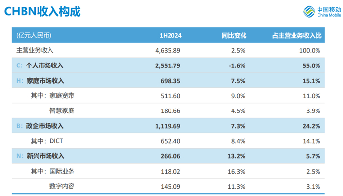 今年上半年,中国移动营收增长保持稳健,盈利能力持续提升,总市值位居全球运营商前列,品牌价值名列前茅。CHBN(个人、家庭、政企、新兴业务)协同促进,其中HBN收入占主营业务收入比持续增长,目前已达到45%,收入结构持续优化。