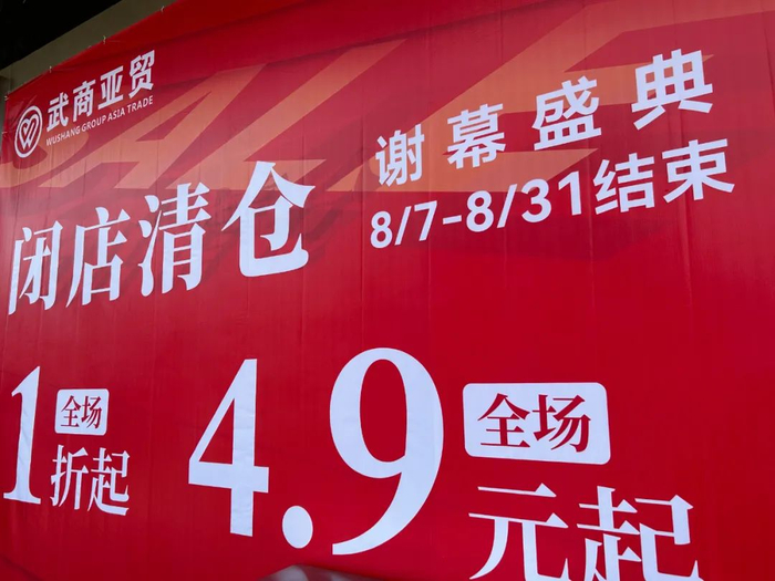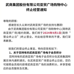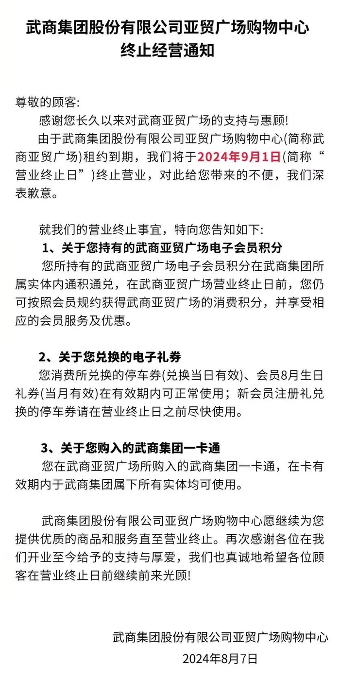 8月7日,武商集团亚贸广场购物中心官微发布通知:因租约到期,亚贸广场将于2024年9月1日终止营业,并在相关业务及人员妥善安排后,拟注销亚贸广场。