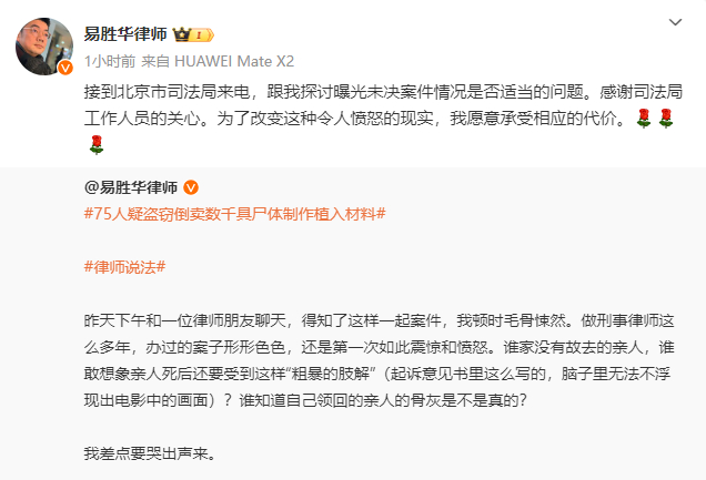易胜华的最新一条微博显示:“接到北京市司法局来电,跟我探讨曝光未决案件情况是否适当的问题。感谢司法局工作人员的关心。为了改变这种令人愤怒的现实,我愿意承受相应的代价。”