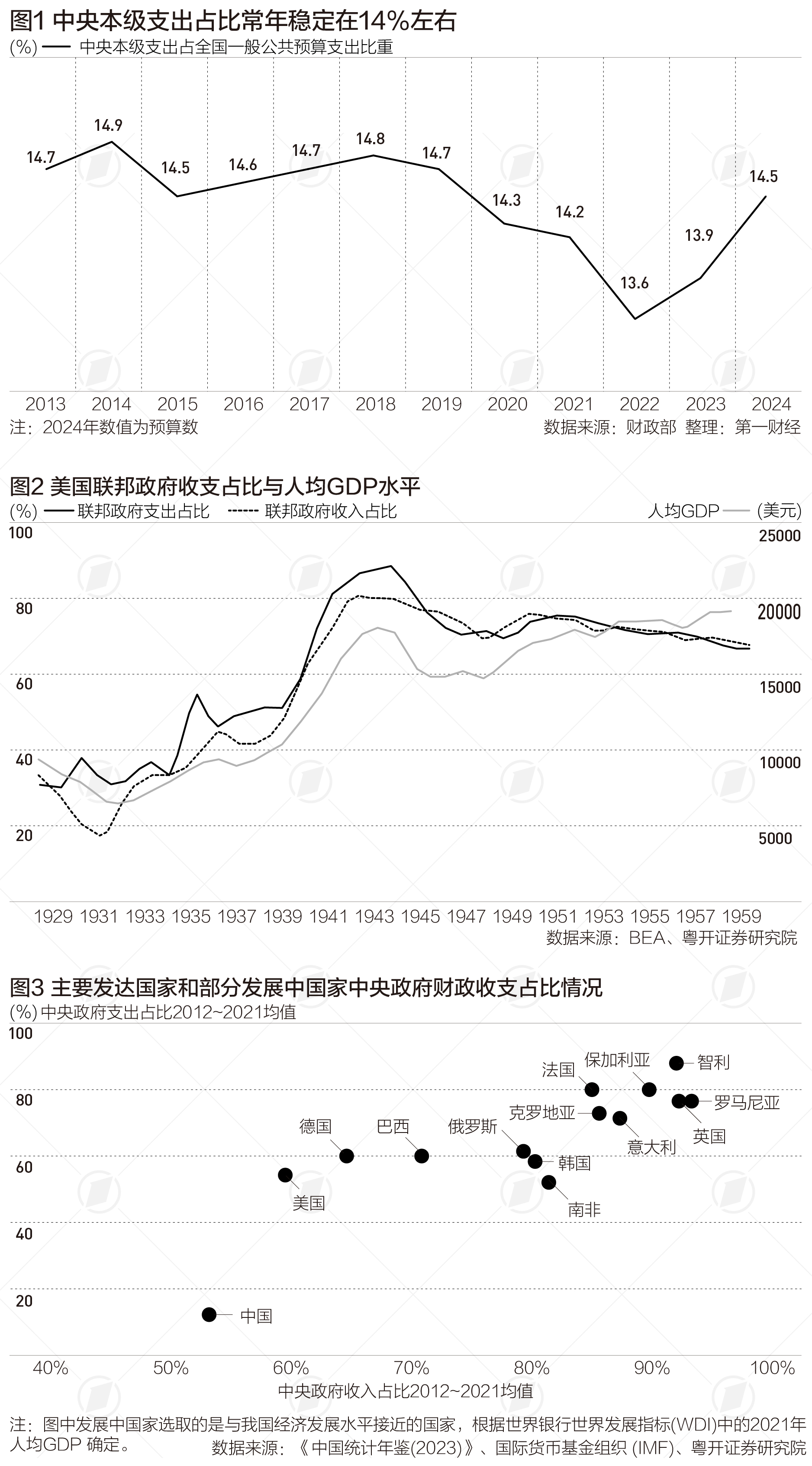 粤开证券首席经济学家罗志恒认为,从国际比较来看,中国的中央财政支出占比明显偏低。从高质量发展需求来看,也亟待提高中央财政支出占比,以更好地发挥中央调节收入分配、促进区域均衡发展、构建全国统一大市场和提高社会保障水平等职能。