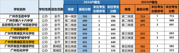 难能可贵的是,首年招收高一的两所中学战绩不俗。广州实验中学首年中考录取分数达到660分,比第二梯度线只少2分,末位考生志愿序号为1;广州市黄埔区苏元学校631分,比第三梯度线高9分,末位考生志愿序号为2。