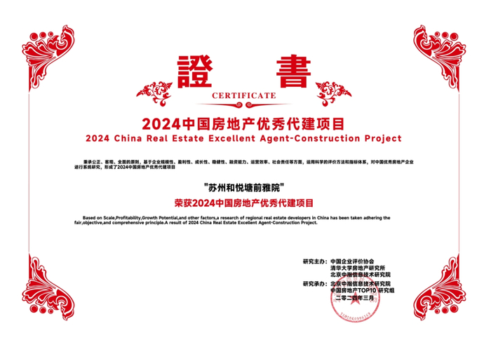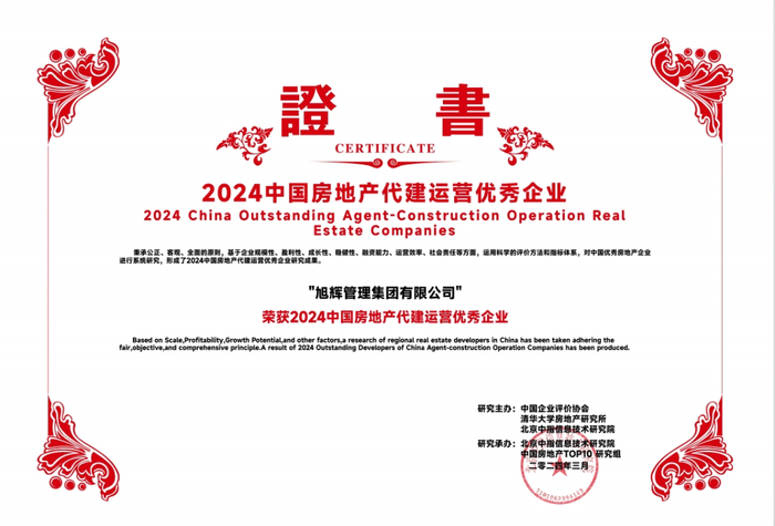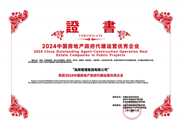 会议发布了2024中国房地产百强企业研究成果,旭辉管理集团有限公司(以下简称:旭辉建管)凭借过硬的专业能力、高质的服务口碑,再次荣获“2024中国房地产代建运营优秀企业”、“2024中国房地产政府代建运营优秀企业”,此外,苏州和悦塘前雅院项目凭借优异的市场表现与产品口碑荣获“2024中国房地产优秀代建项目”。