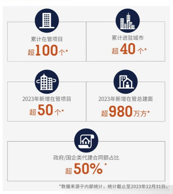成立3年来,旭辉建管发展迅速,已构建起辐射全国的业务版图,2023年,旭辉建管推出“定制化服务体系”,坚持以“为委托方创造价值”为中心,以拼搏勇毅的步伐奋楫笃行,实现新增管理项目50个,新增管理总建面超980万方,累计在管项目突破100个,其中政府与国企类代建项目显着突破,合同额占2023年新获取项目的50%以上,管理规模和经营质量皆创新高,实现了政府代建、商业代建、资本代建、企业定制、管理咨询等多种业务模式的全面覆盖。