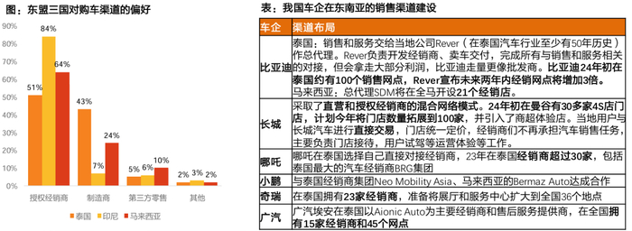 考虑日系品牌压力,我国车企若直接开设直营店建立渠道,可能展业较困难,可通过经销模式快速打开市场,提升品牌影响力,并通过基建投资获得当地政府的支持。24年初,比亚迪在泰国约有100个销售网点,其总代理宣布未来两年内经销网点将增加3倍。