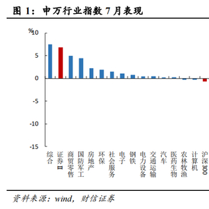 证券行业7月跑赢大市。在31个申万行业指数中位列第2位,证券板块上涨6.79%。