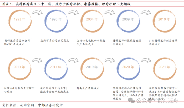 英科医疗聚焦医疗耗材、康养器械、理疗护理三大核心领域。公司成立于1993年,总部设在山东淄博,主营业务涵盖医疗耗材、康养器械、理疗护理三大板块,主要产品包括一次性手套、轮椅、冷热敷、电极片等多种类型的护理产品,产品广泛应用于医疗机构、养老护理机构、家庭日用及其他相关行业。英科医疗主要产品远销美洲、欧洲、亚洲、非洲、大洋洲的120多个国家和地区,在全球范围内服务超10000家客户。经过多年的发展,公司已成为中国最大及全球领先的一次性手套供应商。公司于2017年7月在深圳证券交易所创业板上市。