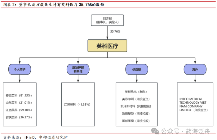 董事长刘方毅先生持有英科医疗35.76%的股份。截止至2024年4月24日,刘方毅先生持有公司35.25%的股份,为公司控股股东和实际控制人。且根据公司2024年5月14日公告,刘方毅先生成功通过集中竞价交易方式累计增持公司股份,增持后刘方毅先生持有公司35.76%的股份。